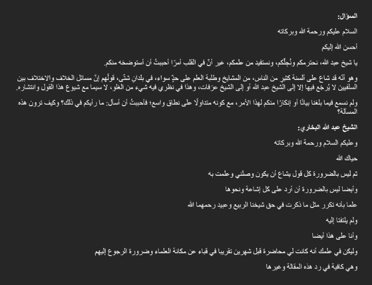„Das ist auch der Grund, warum Scheich Rabī’ und Scheich ‘Ubaid al-Dschābirī gesagt haben, dass man bei solchen Situationen der Fitnah zum Beispiel zu Scheich ‘Abdullah al-Buchārī und Scheich ‘Arafāt gehen soll. Warum haben diese Gelehrten Scheich ‘Abdullah al-Buchārī empfohlen und Scheich ‘Arafāt und nicht zum Beispiel Scheich Ṣāliḥ al-Fauzān oder Scheich ‘Abdul ‘Azīz Āl asch-Scheich?”