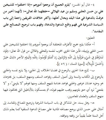 Doch in Wirklichkeit wollen sie damit erreichen, dass man zu einem bestimmten Scheich zurückkehrt, den sie praktisch zum Maßstab der Salafis gemacht haben. Dies geschieht nach der bekannten Vorgehensweise von al-Ḥalabī und al-Ma’ribī, bei der die Menschen an eine bestimmte Person gebunden werden sollen, zu der sie in allen Angelegenheiten zurückkehren müssen, wie bereits erläutert.