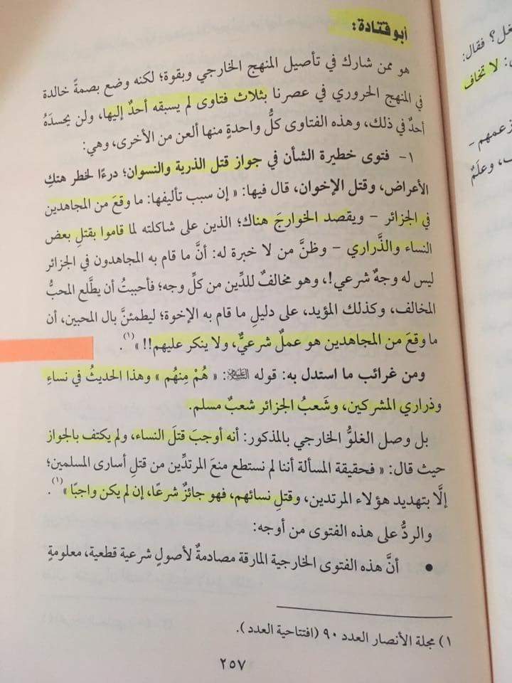 Einer dieser unwissenden Häupter der viel Unheil in der islamischen Welt verbreitet hat ist Abū Qatāda al-Filaṣṭīnī. Es gibt zahlreiche Urteile von Abū Qatāda al-Filaṣṭīnī, inder er es erlaubte Frauen und Kinder zu töten. Ein Beispiel ist im 1995 Anṣār Magazin, Ausgabe 90, Seite 12 zu finden, indem er sagte:
