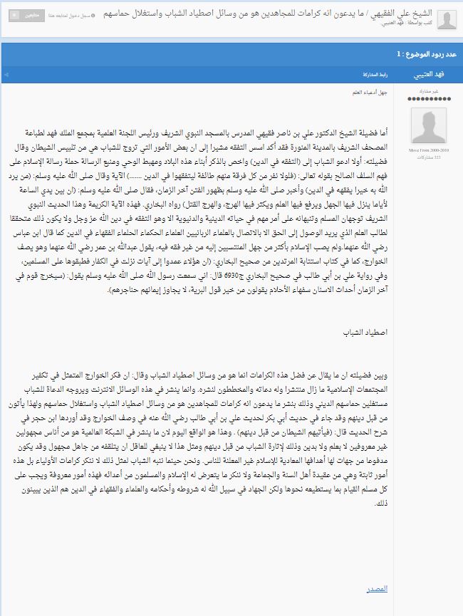 Scheich ‘Alī ibn Nāṣir al-Faqīhī, ein Lehrer in der edlen Prophetenmoschee (in Medina) und Vorstand der Kommission des Wissens in der Qur‘ān-Druckerei (رئيس اللجنة العلمية بمجمع الملك فهد لطباعة المصحف الشريف) in Medina bestätigte die Grundlagen des Lernens (in der Religion) und machte auf einige Angelegenheiten aufmerksam, mit denen Jugendliche (von Extremisten) angeworben werden, welche aber in Wirklichkeit von den Täuschungen des Satans sind.